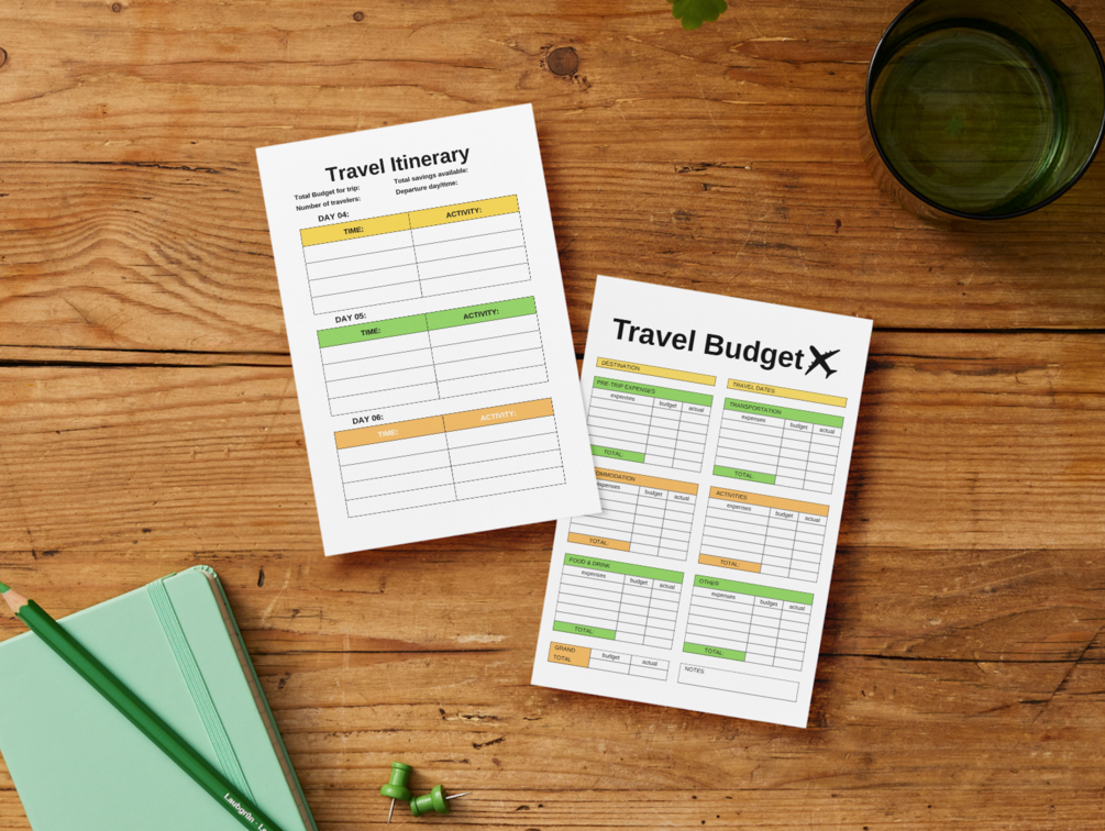 PDF file to print- travel itinerary, budget planner, and packing list